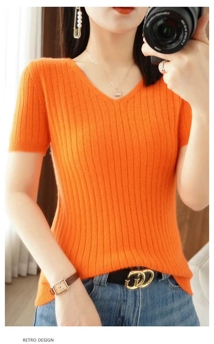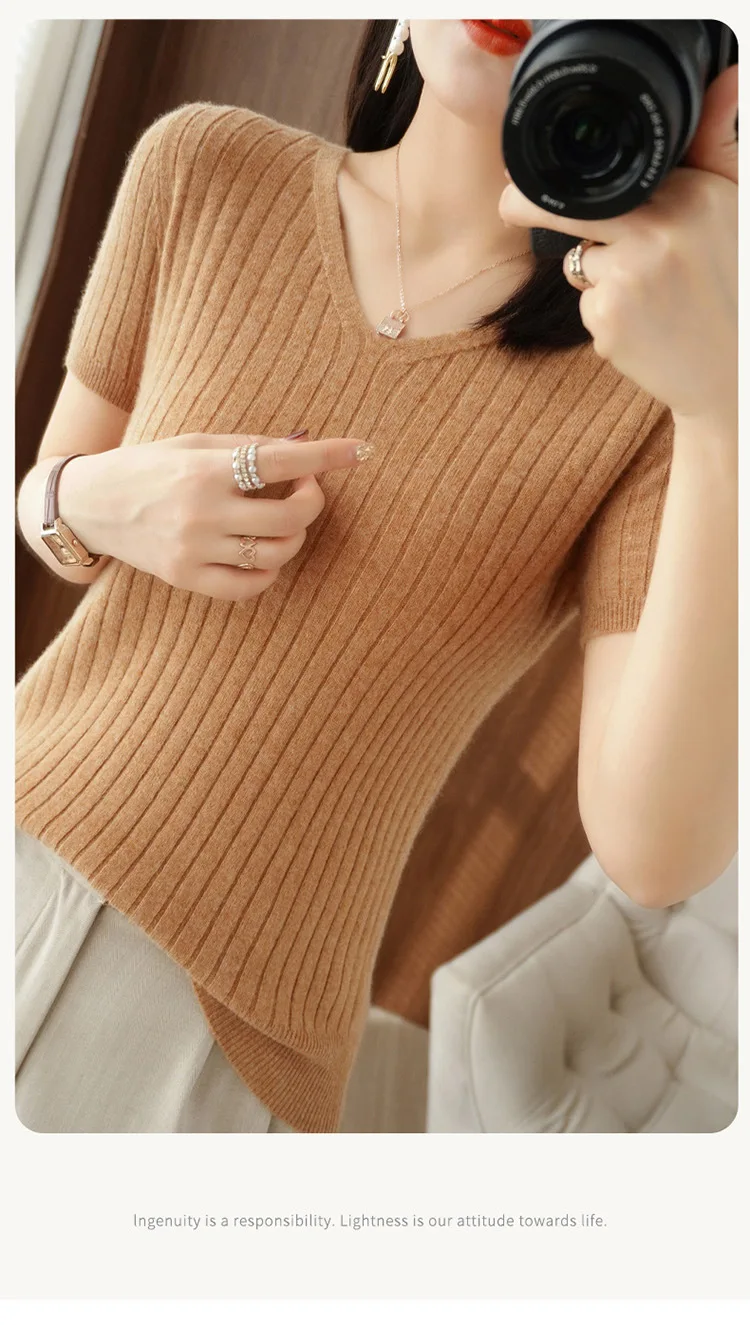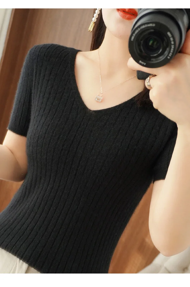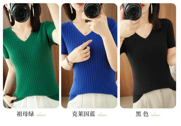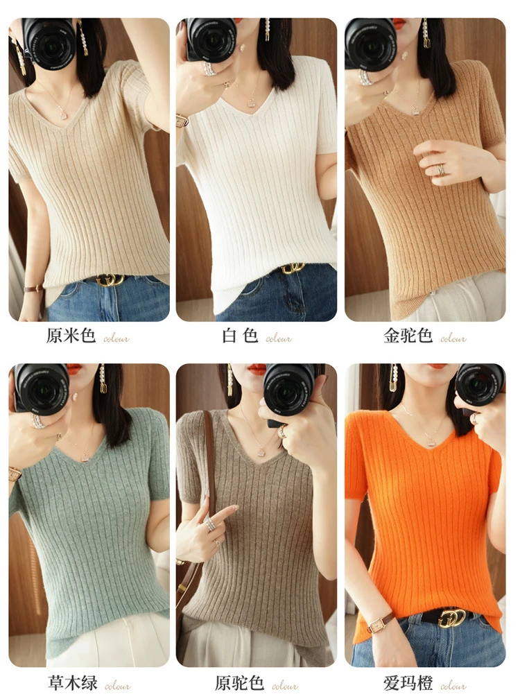 2023 Spring Summer Women Sweater V-neck Short Sleeve Tshirt Korean Fashion Knitwears Slim Fit Pullovers Bottoming Inner Knit Top