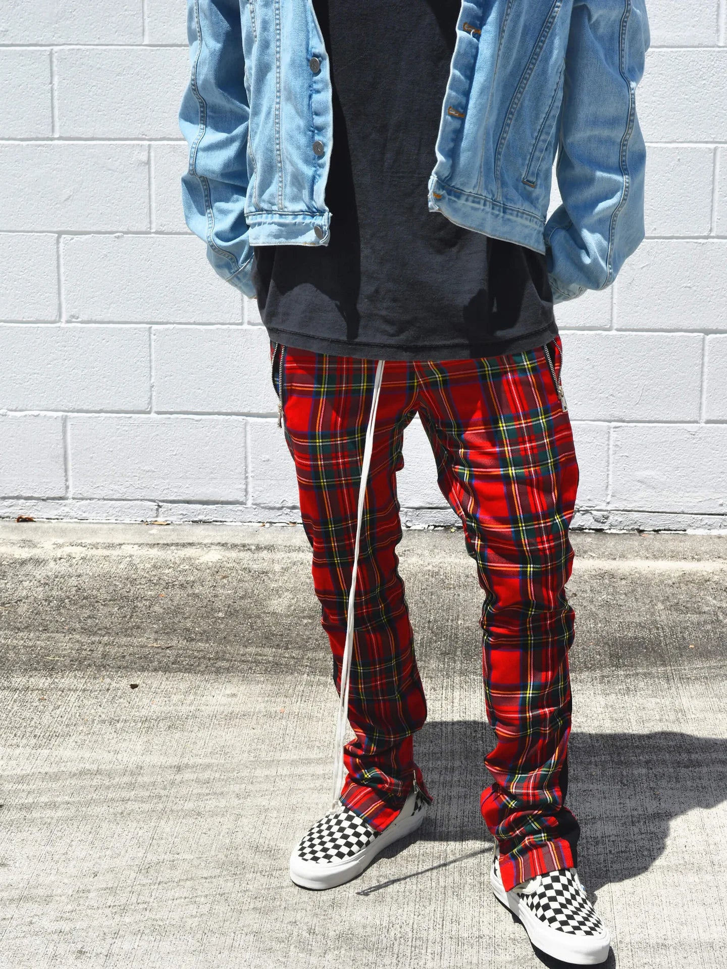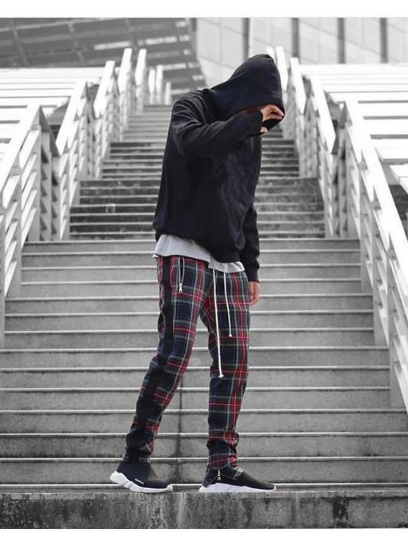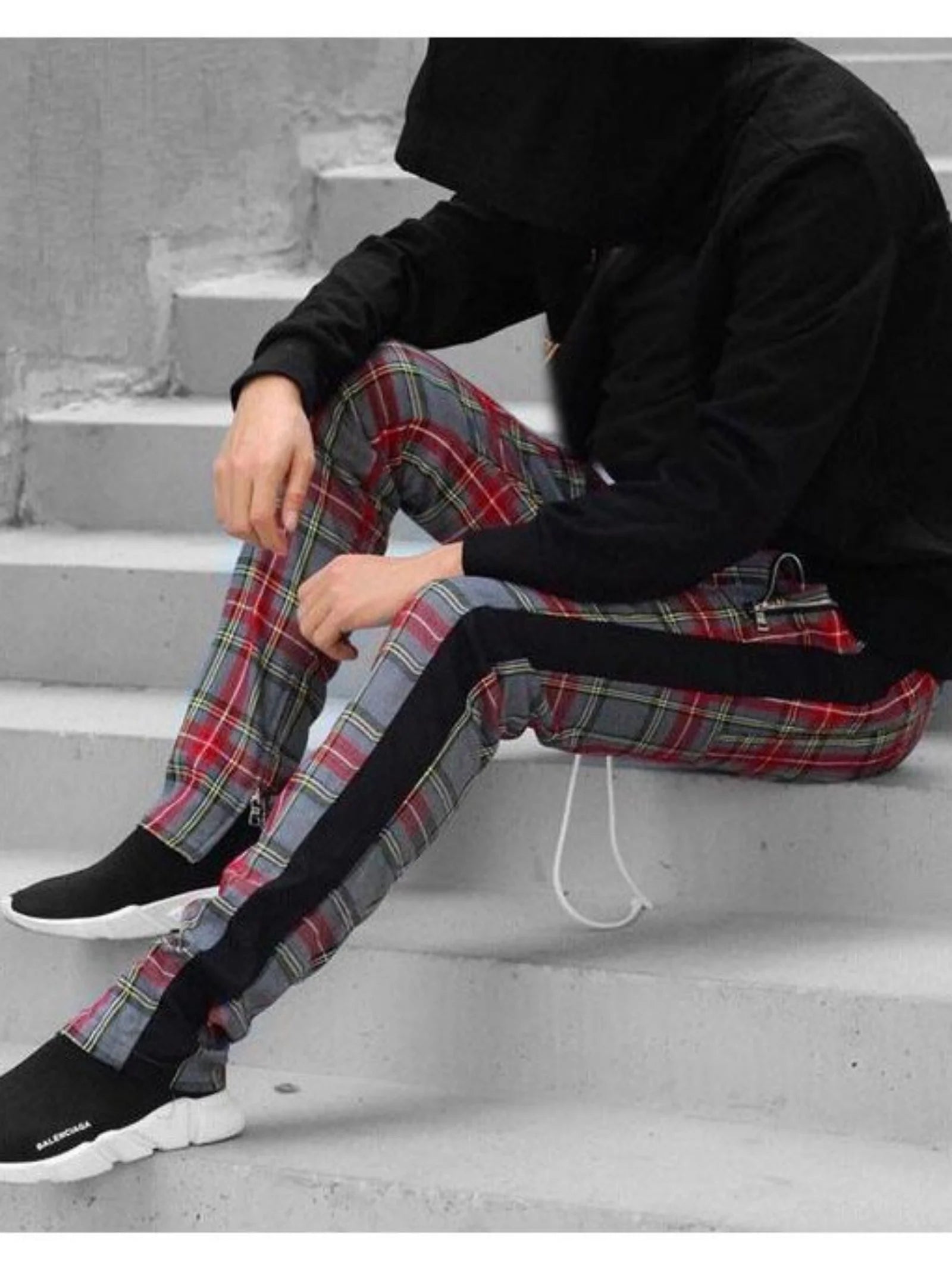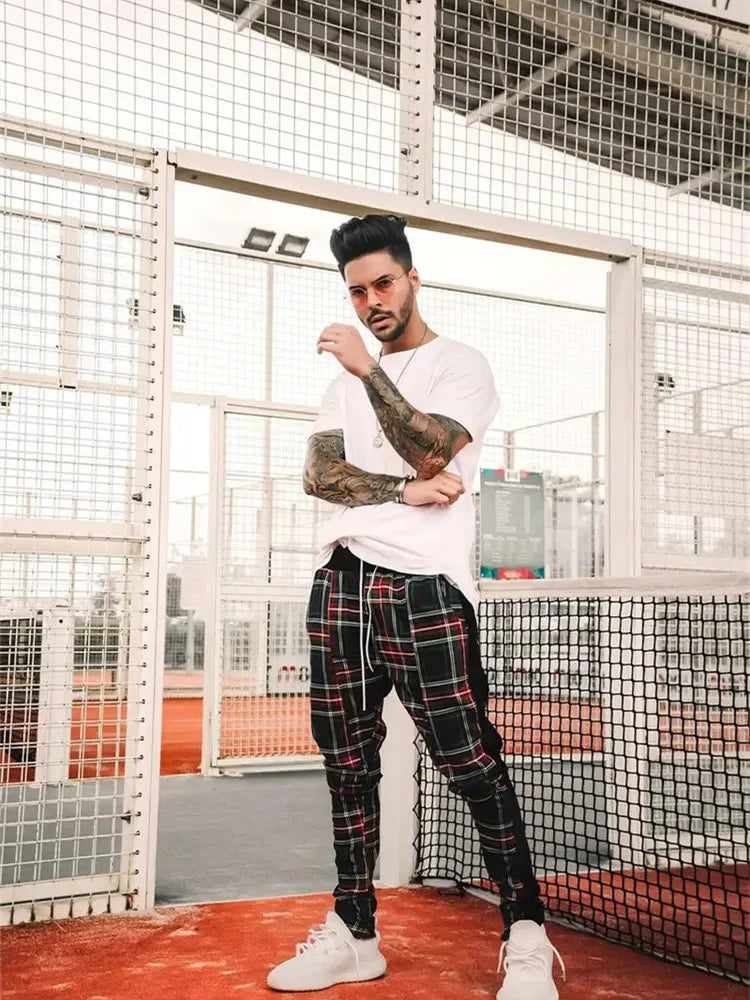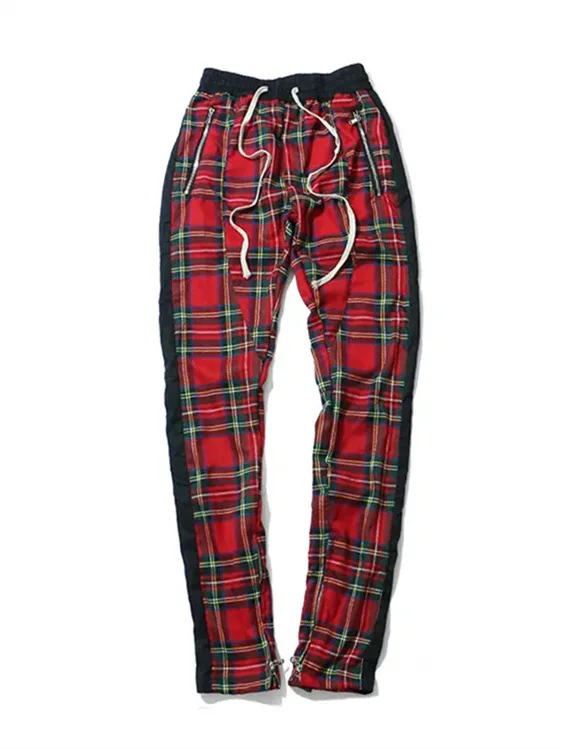 2024 Spring and Autumn hip hop pants Scottish lattice zipper slim pants men's casual pants elastic waist sports hipster men