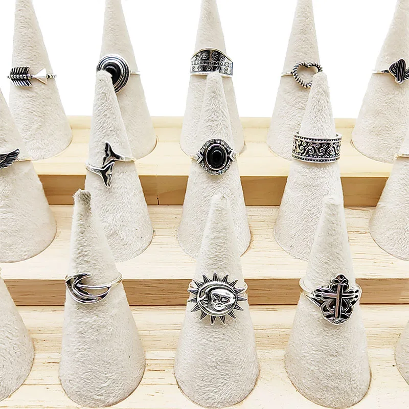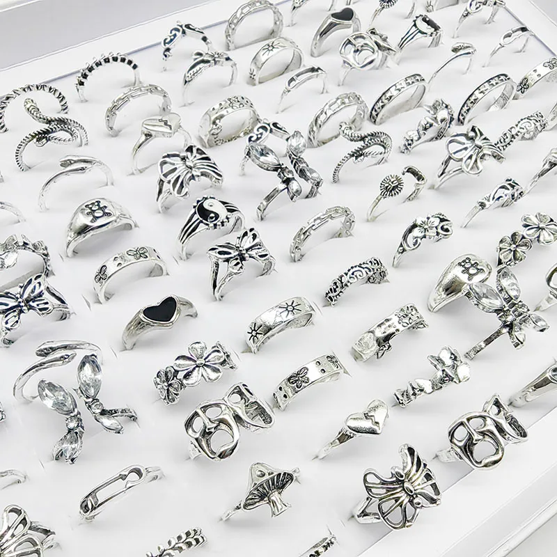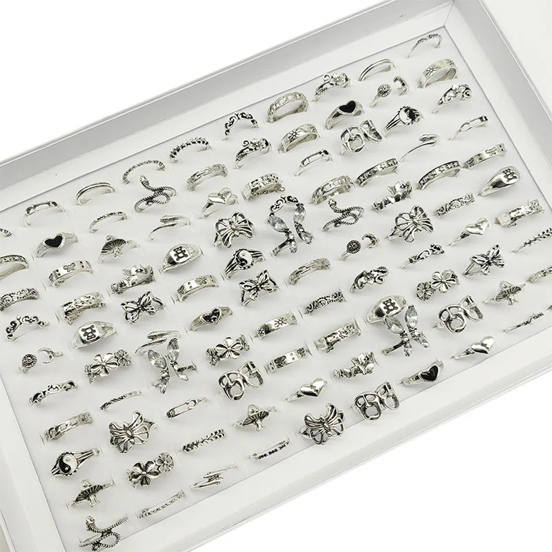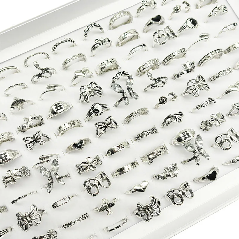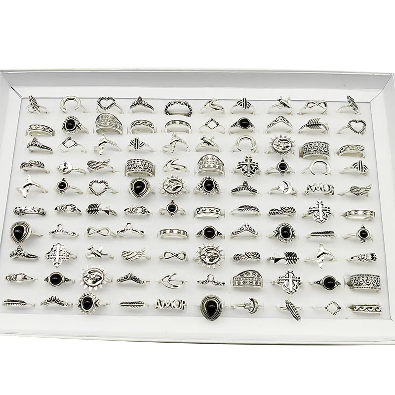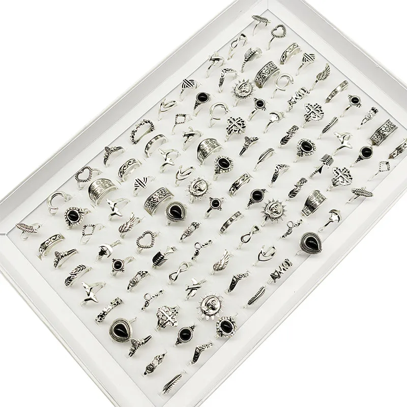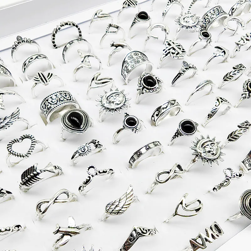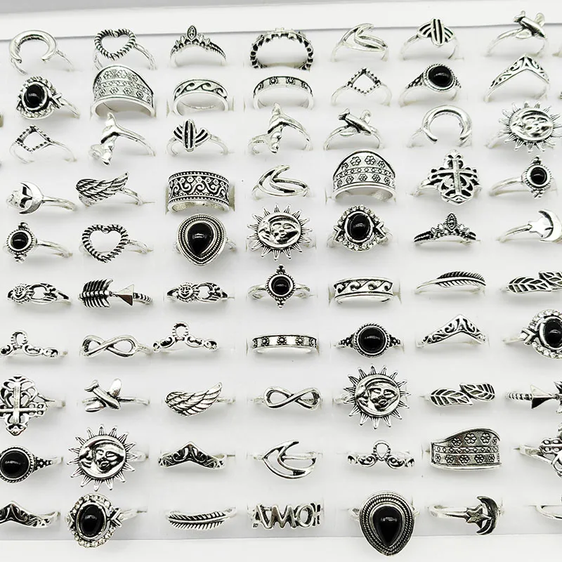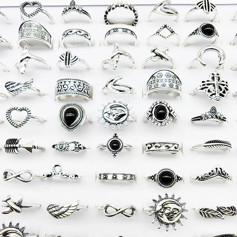 30pcs/Lot Wholesale Antique Silver Color Finger Rings For Women New Black Acrylic Stone Crown Water Drop Angel Wing Jewelry Girl