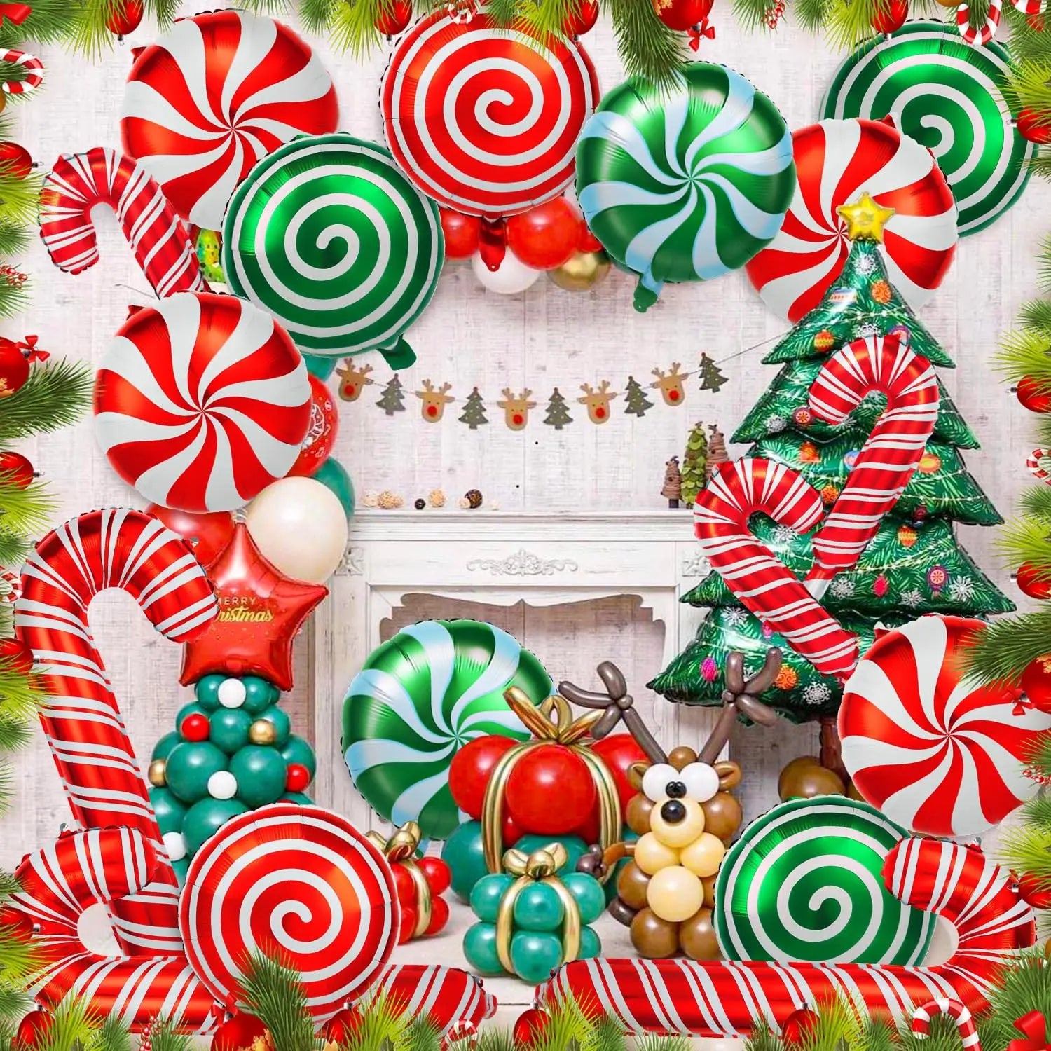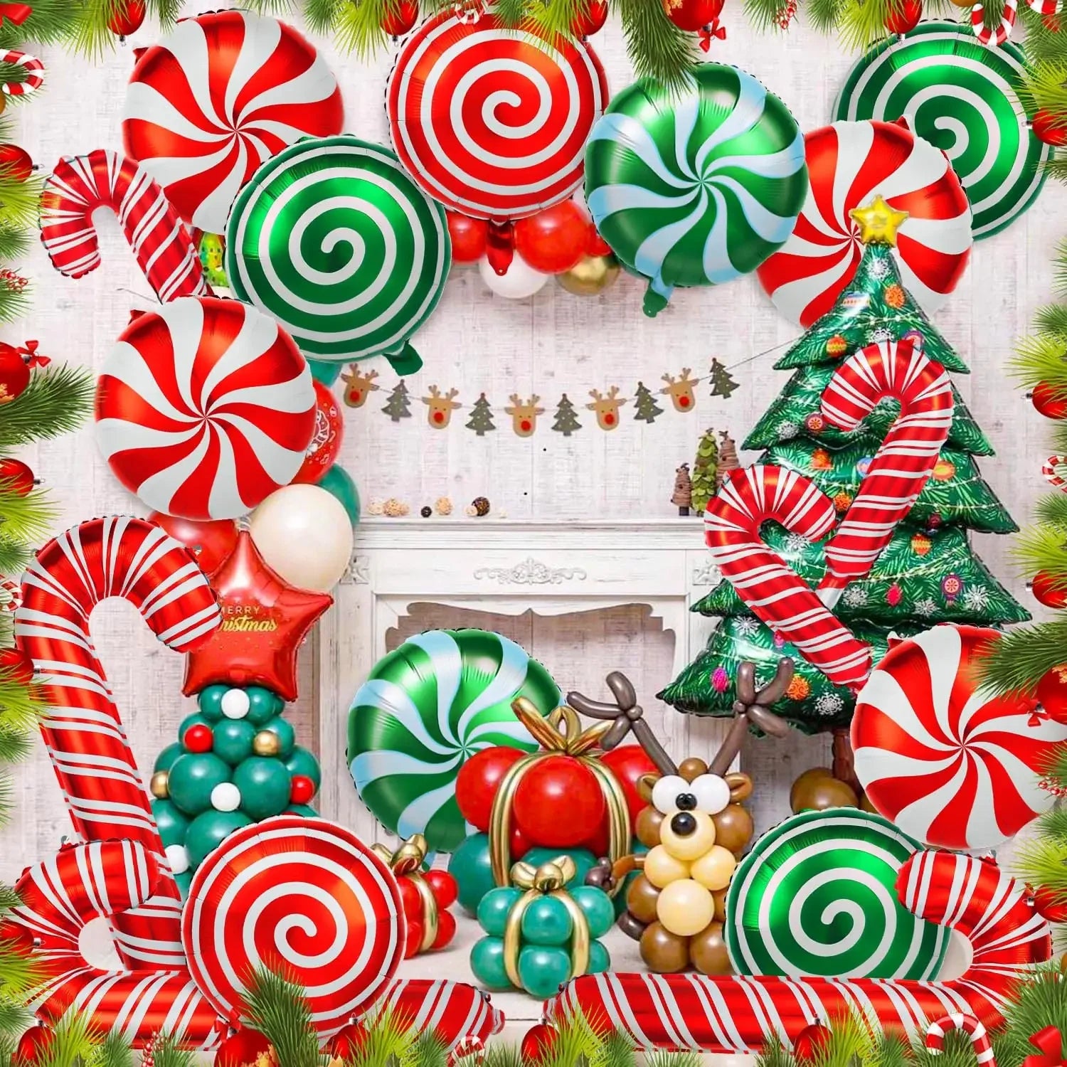 36Pcs Christmas Candy Balloons Kit Large Cane Swirl Candy Foil Balloons Red Green Foil Sweet Candies Theme Balloons