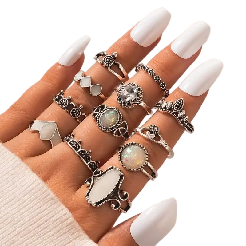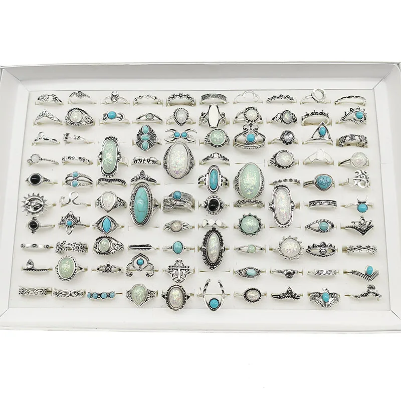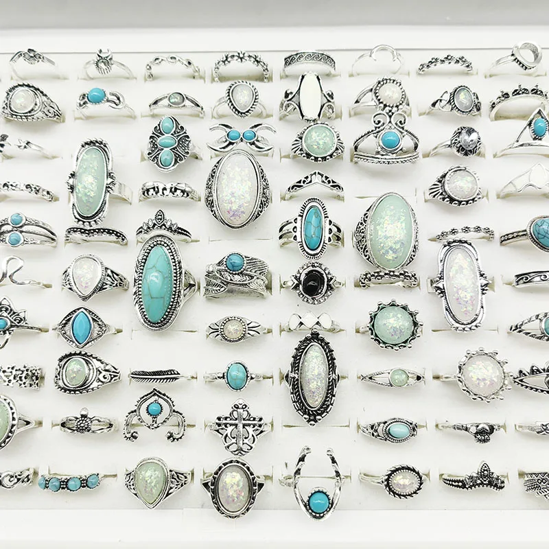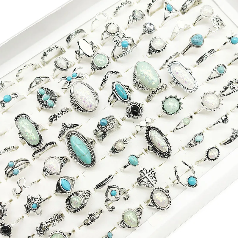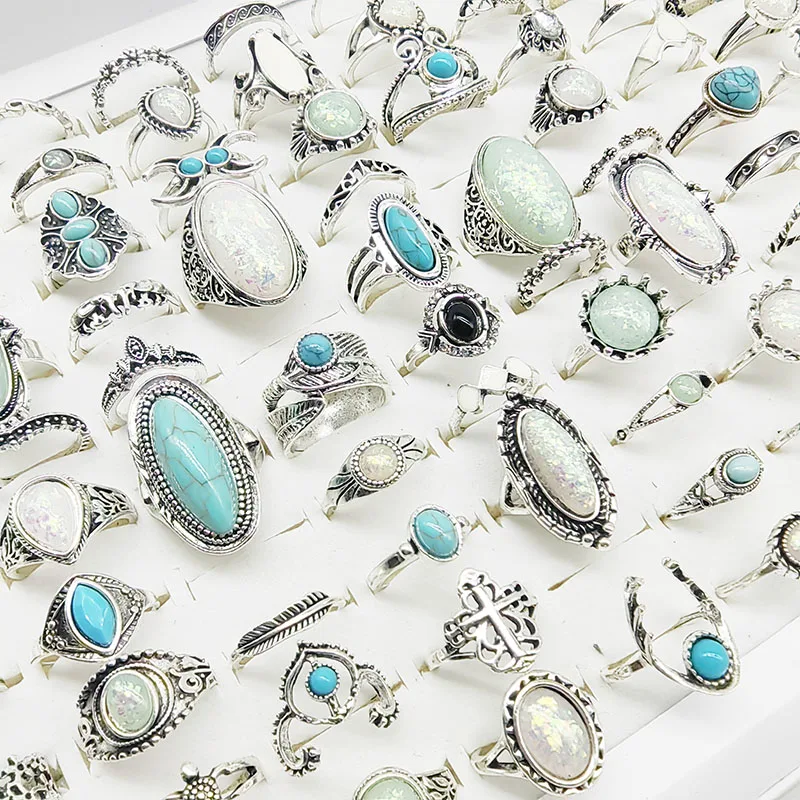 50pcs/Lot Wholesale New Big Opal Stone Finger Rings For Women Bohemia White Enamel Acrylic Water Drop Carved Hollow Jewelry Girl