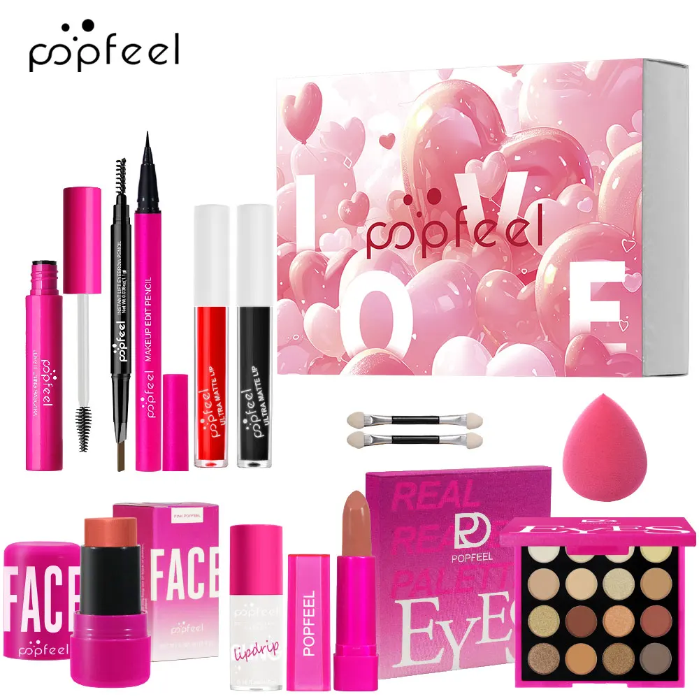 POPFEEL 12-Piece Valentine's Day Makeup Set - Includes Eyeshadow, Blush, Lipstick, Lip Gloss, Mascara, Eyebrow Pencil, Eyeliner.