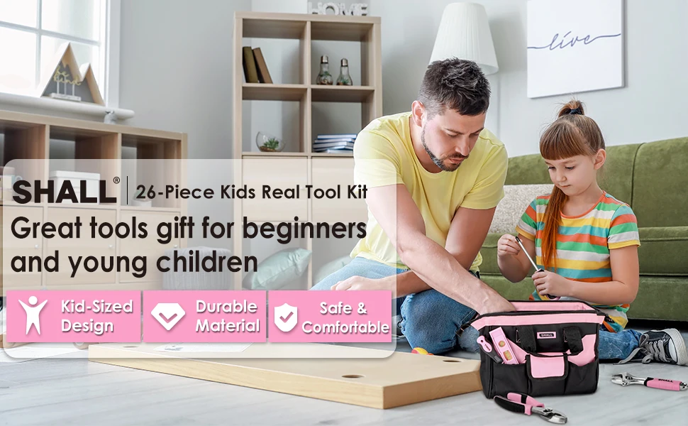SHALL 26Psc Kids Size tools kit set with 12" Tool Bag Safety woodworking tools Children Tool Kit with Hand Tools Home DIY