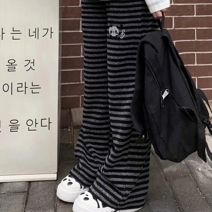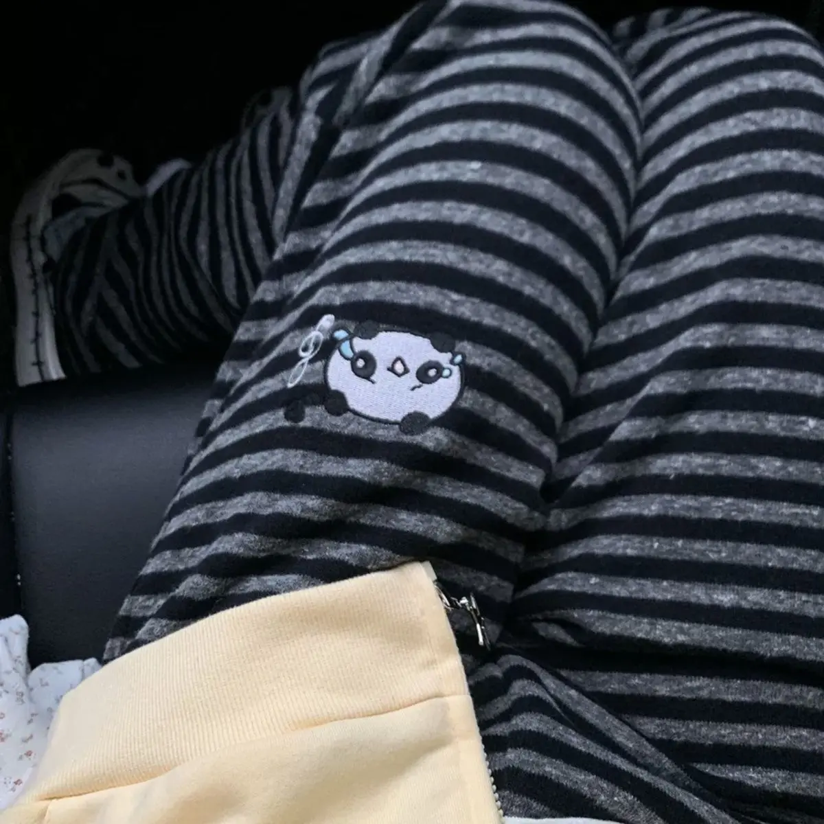 Streetwear Harajuku Stripe Wide Leg Trousers Y2k Kawaii Panda Embroidery Straight Pants Loose Vintage Casual Pantalones Women